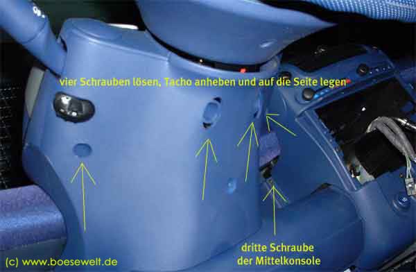 Diese Anleitung geht von meinem 8/99er passion mit Uhr und Drehzahlmesser aus! Nicht serienmässige Teile (Uhr, DZM, Navi-Monitor, Handyhalterung) sind natürlich nicht für jeden gültig...