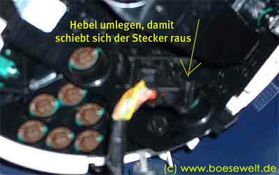 Diese Insel wird jetzt abgeklemmt und beiseite gelegt (Ich habe für alle Kleinteile und später das Armaturenbrett meinen leeren Kofferraum genutzt). Die Stecker sind alle gesichert, die wegzudrückenden Nasen sind aber durch die Bank deutlich zu erkennen.