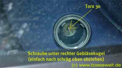Auf der rechten Seite muss nun die Lüftungskugel abgezupft werden (einfach schräg abziehen) und die darunter befindliche Schraube (Torx 30) gelöst werden.