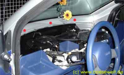 Das Armaturenbrett wird jetzt nur noch gehalten durch 3 Klammern am unteren Windschutzscheibenrahmen - das Armaturenbrett vom Fahrersitz aus anheben (vielleicht 15 cm, aber das merkt man schon - muss halt übers Lenkrad!) und mit sanfter Gewalt die drei Klammern abziehen (auf dem rechten Bild durch rote Punkte ungefähr markiert), dann drehen und aus dem Auto heben und in den Kofferraum legen.