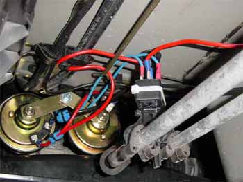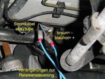 dort können das Kabel beschädigen. Praxistip: Hilfreich für diesen Schritt ist es, die Tülle aus dem Loch zu nehmen, von hinten (=innen) mit einer Spitzzange das Kabel durch ein vorher hineingestochenes Loch zu ziehen. Ziehen Sie das Kabel stramm, befestigen Sie das Relais mit Kabelbindern wie auf den Fotos zu erkennen, kleben Sie das Kabel am Batteriekasten fest, ziehen Sie die Schrauben an der Hupe so fest, dass beide Hörner möglichst nirgendwo anschlagen und frei schwingen können. |