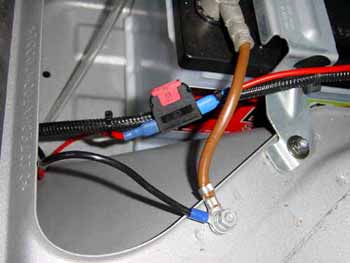 Nun bauen Sie bitte nach obigem Muster mit dem schwarzen Kabel die Verbindung für Masse (den "Minuspol"). Der Unterschied besteht nur darin, dass Sie das lange Kabel NICHT abschneiden, da es nachher zur Batterie geführt werden soll. Das lange Ende bleibt also offen, um es später in den Batteriekasten ziehen zu können.